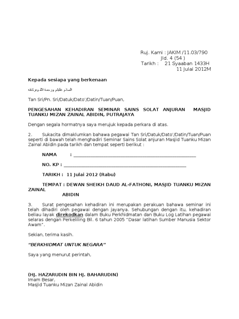 Sila fakskan surat pengesahan kehadiran ini ke pejabat pusat islam no. SURAT PENGESAHAN JAWATAN MAJIKAN. Surat Pengesahan Kehadiran Mesyuarat - Contoh Surat Pengesahan Kehadiran Kursus.